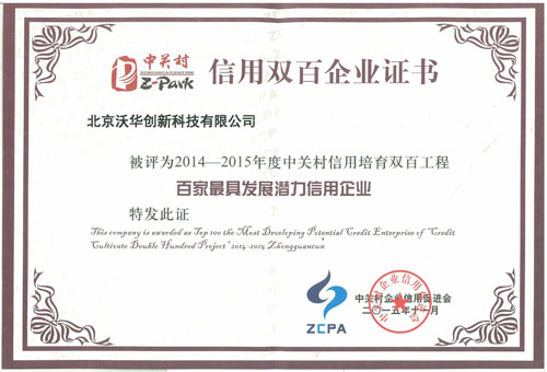 Among them, Beijing wohua Innovation Technology Co., Ltd. was rated as one of the "top 100 credit enterprises with the most development potential in Zhongguancun in 2015" by virtue of its many years of standing in Zhongguancun Science and Technology Park, vigorously developing scientific and technological innovation, and abiding by its corporate commitments.