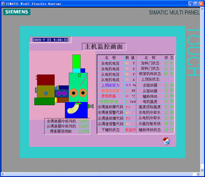 ● 故障与生产工艺的连锁。在正常的生产过程中如果发生严重故障,现场触摸屏自动指示并启动声光报警,此时,如果故障不处理,则延时停机,故障消除后主机方可正常运行。主机的保护停机与水温、传动和各类工艺条件均有连锁控制。