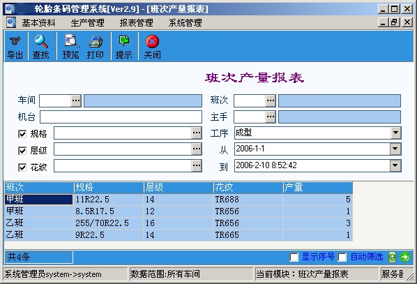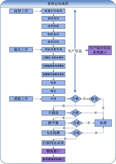 在轮胎生产行业中,轮胎条码信息管理系统为炼胶、压延、胎面胎侧压出、内衬压出、钢丝圈、裁断、成型、硫化、质检各个生产环节提供信息化的管理。通过条码标识实现成型、硫化生产信息准确实时的记录,实施本系统后不仅可以增加成形硫化质量追溯信息的准确性、实时性,而且现存的胎号管理混乱、库存信息的准确率较低、轮胎信息不易追溯,较难满足汽车召回制度要求的问题可得到明显的改善。